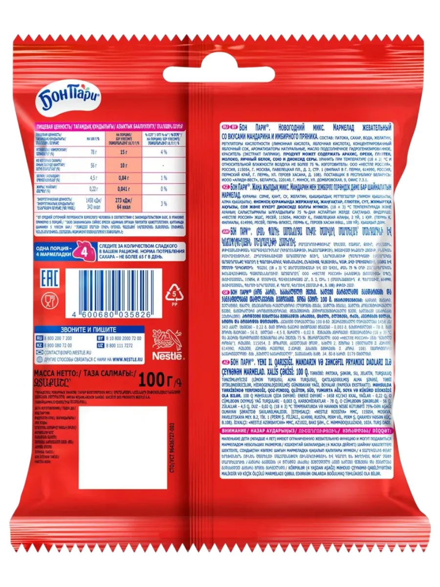 Лимитированная новогодняя серия жевательного мармелада Бон Пари. Создайте праздничное настроение вместе с ярким новогодним миксом мармеладок со вкусами мандарина и имбирного пряника в кислой посыпке. Праздничную упаковку всегда можно разделить с друзьями и семьей в преддверии Нового Года, или преподнести в качестве подарка. Наслаждайтесь новогодним миксом мармеладок в праздничных формах, но не забывайте о рекомендуемой порции сладкого. Жевательный мармелад Бон Пари Новогодний микс не содержит искусственных красителей.
