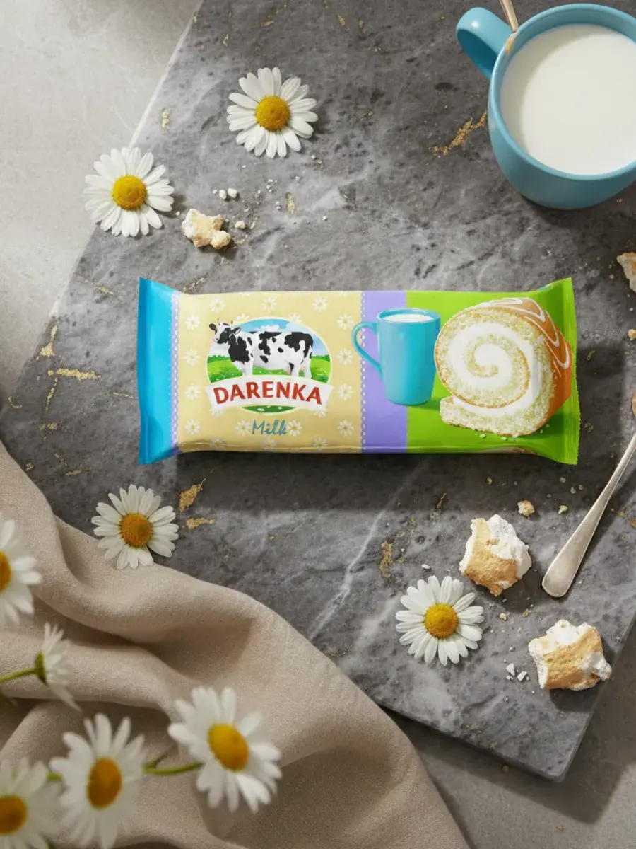 Рулет Darenka с молочным вкусом — это нежность, созданная для уюта. Мягкий бисквит с воздушным кремом буквально растворяется во рту, оставляя приятное молочное послевкусие, как стакан свежего молока в детстве. Этот десерт — о простых радостях: о тепле, заботе и домашнем комфорте. Стоит только открыть упаковку, и дом наполняется ароматом свежей выпечки и спокойствием. Darenka — это не просто сладость, а минутка тишины и удовольствия, которую хочется продлить. Идеален к чашке чая, кофе или просто для того, чтобы подарить себе немного сладкого счастья.