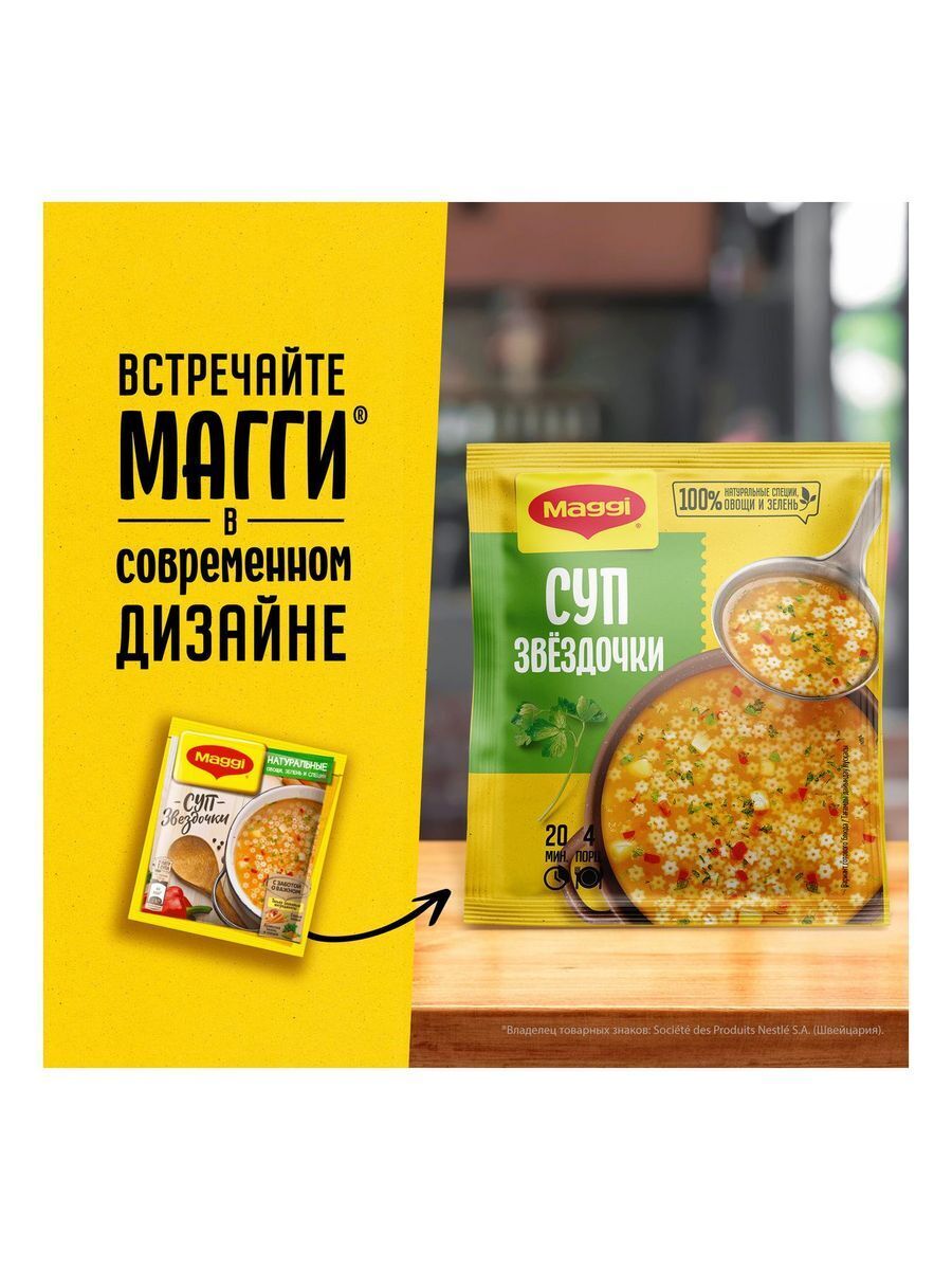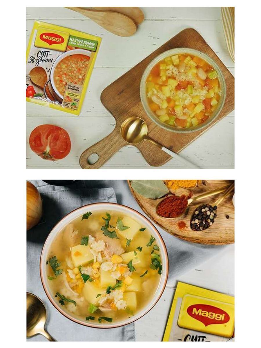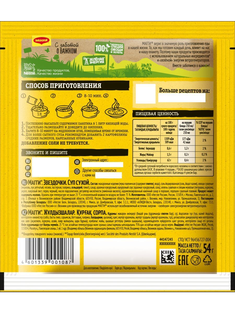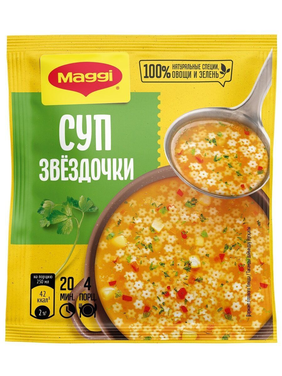 MAGGI Суп Звездочки — это суп знакомый с детства. Мясной суп с овощами и оригинальными макаронами в виде звездочек придется по вкусу и взрослым, и детям. В его состав входят только знакомые ингредиенты: лук, морковь, паприка, вермишель высшего сорта, йодированная соль, травы и специи. 1. Постепенно высыпьте содержимое пакетика в 1 литр кипящей воды. 2. Тщательно размешайте и доведите до кипения. 3. Варите 8-10 минут на медленном огне, помешивая время от времени. 4. Для более сытного супа рекомендуем добавить 2 картофелины средних размеров, нарезанные кубиками.