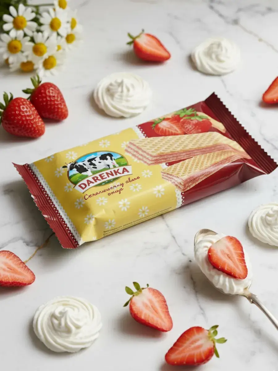 Вафли Darenka Клубника со Сливками — это тот самый уютный сценарий «хруст — и стало лучше». Тонкие, хрустящие вафли щедро прослоены нежным кремом с яркими клубничными нотами, которые напоминают о спелых ягодах и холодных сливках из детства. Баланс сладости выверен: не приторно, а по-домашнему вкусно, поэтому вафли одинаково хорошо заходят к чаю, кофе и какао. Удобный формат — идеальный сладкий перекус на работе, в дороге или к фильму вечером; дома их легко превратить в быстрый десерт: добавь ломтик свежей клубники, ложку йогурта или шарик пломбира — и у тебя готов мини-десерт «клубника со сливками» за минуту. Вафли Darenka держат ту самую «хрустящую планку» — первый укус звучит, второй влюбляет, третий убеждает положить ещё одну пачку в корзину «на потом». Если ищешь вафли с кремом без лишней тяжести — возьми этот вариант: лёгкие, ароматные, по-летнему яркие и по-зимнему уютные.